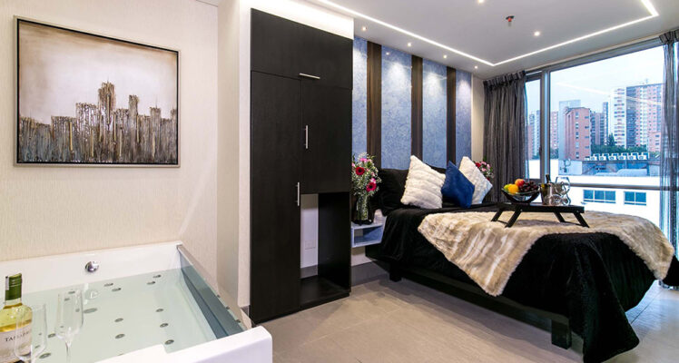 Como estándar en todas nuestras habitaciones de lujo, la Excelsior Suite 604 cuenta con un baño privado, una TV inteligente de alta definición, aire acondicionado, minibar y acceso seguro con tarjeta de acceso. Además, nuestros huéspedes pueden disfrutar de servicios adicionales que incluyen desayuno, recepción las 24 horas y acceso a nuestra piscina y bar en la azotea. Desde esta privilegiada ubicación, podrás admirar una impresionante vista panorámica de 360° de la cautivadora ciudad de Medellín.
